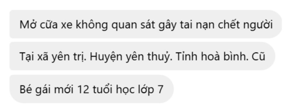 Một xe ô tô con đỗ ven đường bất ngờ mở cửa mà không quan sát phía sau, đúng lúc hai học sinh đang trên đường đi học thêm về. Cùng thời điểm, một xe khách 16 chỗ chạy với tốc độ cao lao tới, không kịp tránh, Hậu quả đau lòng khiến một cháu học sinh 12 tuổi mãi mãi không thể trở về ăn Tết cùng gia đình tại Hòa Bình.