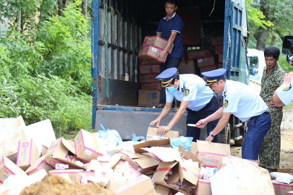 Cán bộ Quản lý thị trường tỉnh Lào Cai tiến hành tiêu hủy hàng hóa vi phạm. Ảnh: Chi cục Quản lý thị trường tỉnh Lào Cai