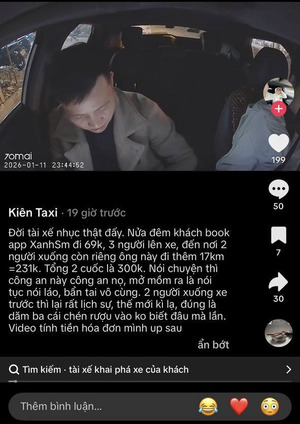 Đời tài xế nhục thật đấy. Nửa đêm khách book app XanhSm đi 69k, 3 người lên xe, đến nơi 2 người xuống còn riêng ông này đi thêm 17km = 231k. Tổng 2 cuốc là 300k. Nói chuyện thì công an này công an nọ, mở mồm ra là nói tục nói láo, bẩn tai vô cùng. 2 người xuống xe trước thì lại rất lịch sự, thế mới kì lạ, đúng là dăm ba cái chén rượu vào không biết đâu mà lần.