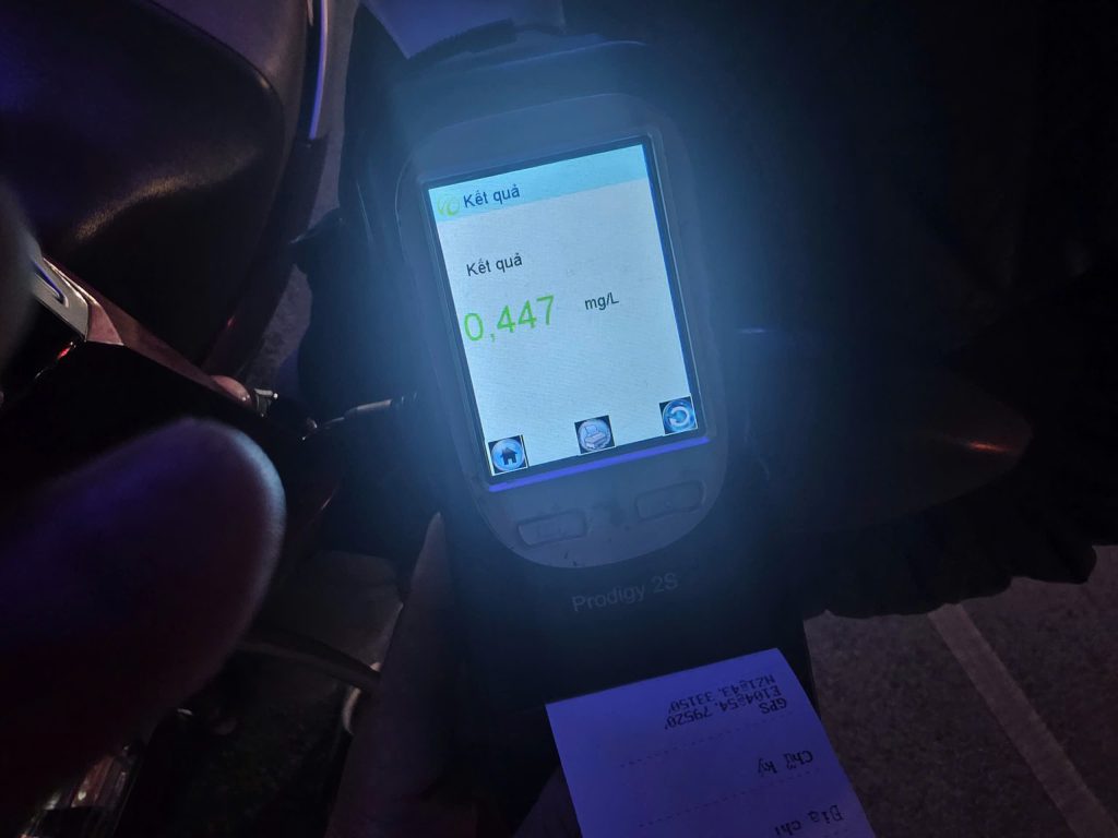 Đến 20h50, lực lượng chức năng tiếp tục kiểm tra, phát hiện anh Nguyễn Tuấn D (SN 1981), trú phường Văn Phú, tỉnh Lào Cai, điều khiển xe mô tô BKS 21B2-154.xx vi phạm nồng độ cồn ở mức 0,447 mg/lít khí thở – mức vi phạm cao nhất.